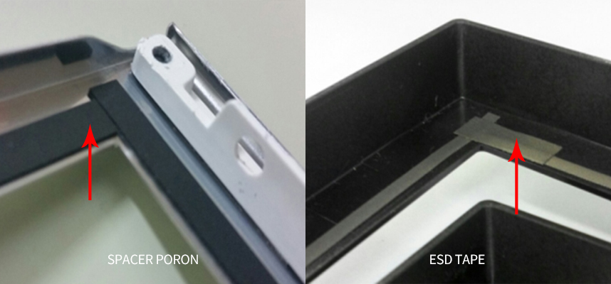 - - LED / CASE TOP Panel Protect Spacer Poron: Panel protection and light leakage prevention - Front Cover ESD (Electric Shock Defense) Tape - Poron: Conductive Poron and general Poron - ESD: ESD Tape and Single-sided Tape